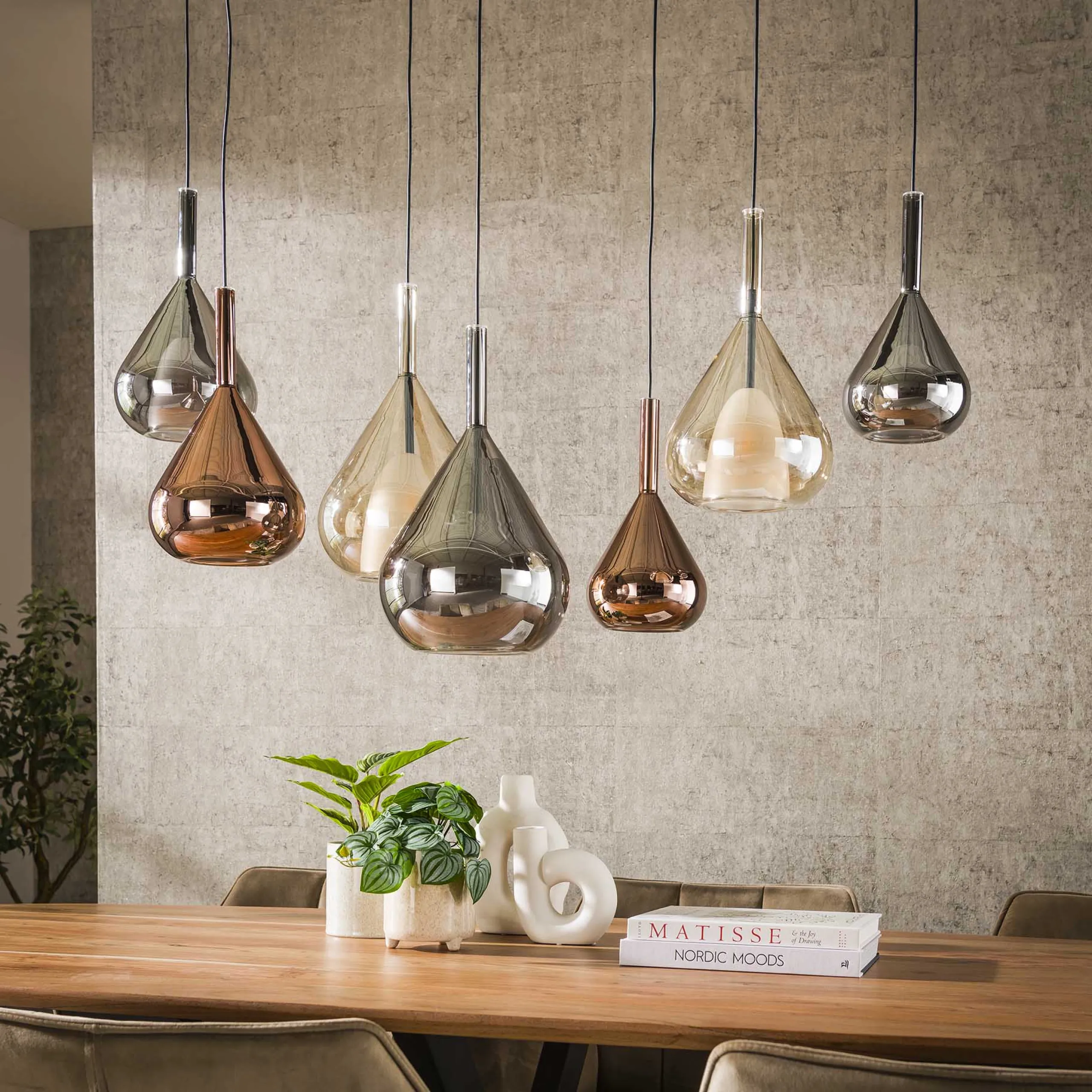 Verleihen Sie mit dieser exquisiten Hängelampe die mit sieben tropfenförmigen Glasschirmen in unterschiedlichen Größen begeistert,Ihrem Wohnraum einen Hauch von Kunst und stilvoller Eleganz. Die Schirme in edlen Bernstein-, Kupfer- und Chromtönen versetzen jeden Raum in eine warme, einladende Atmosphäre und bringen gleichzeitig einen modernen Akzent in Ihrem Wohnbereich.