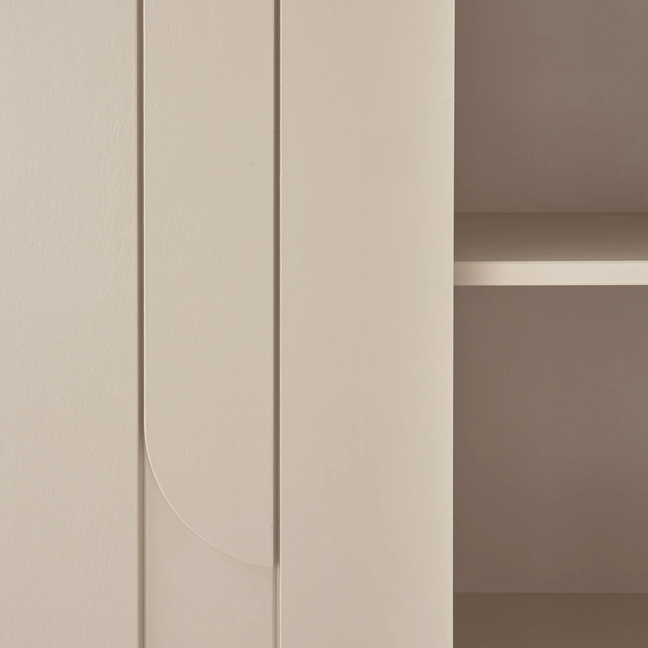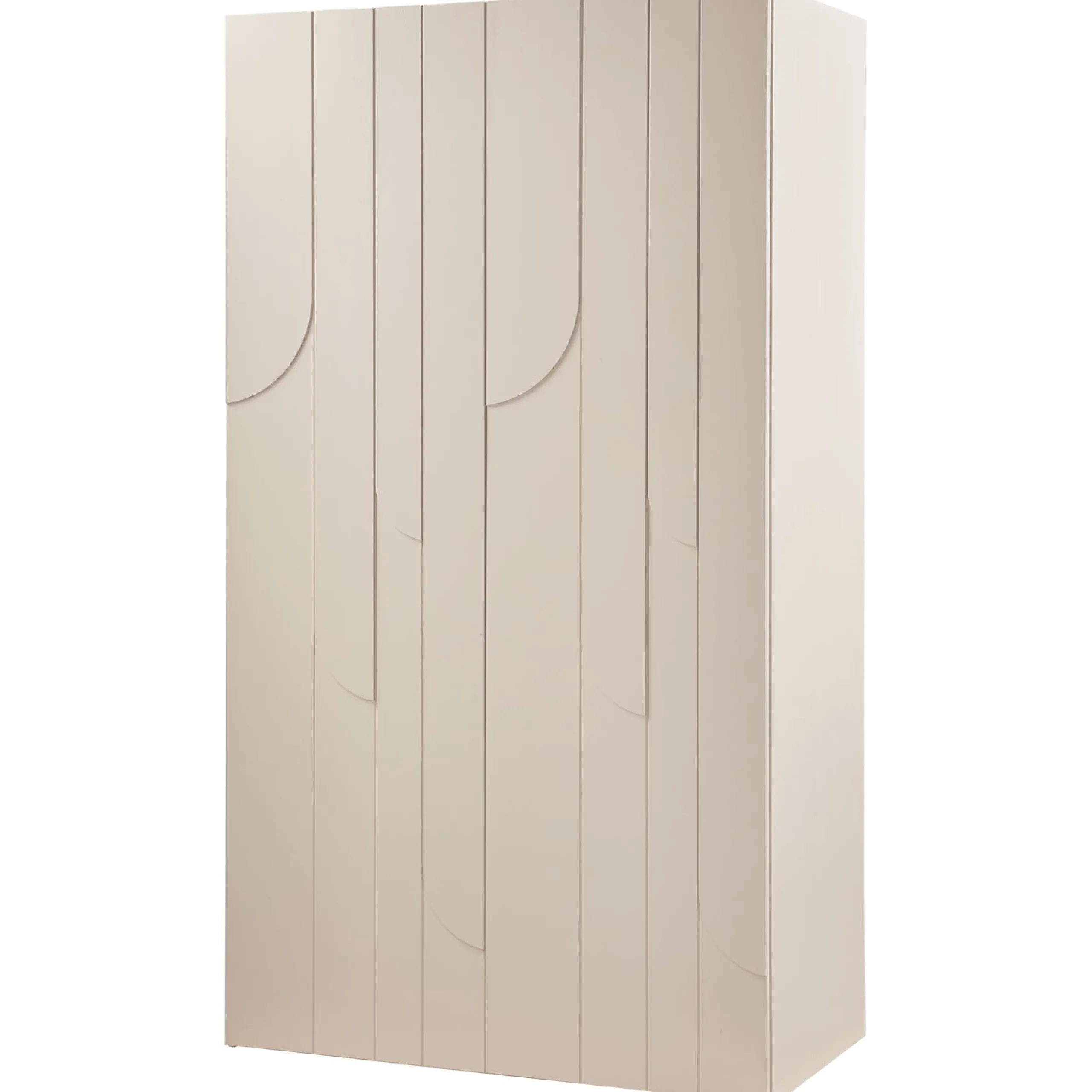 Dieser stilvolle Kleiderschrank aus massivem Kiefernholz vereint Funktionalität mit ästhetischem Design. Die Fronten sind mit einem einzigartigen wellenförmigen Muster gestaltet, das an Regentropfen erinnert, die sanft an Fensterscheiben herablaufen – ein echter Blickfang in Ihrem Schlafzimmer. Das natürliche Kiefernholz in einem ruhigen Beigeton sorgt für eine harmonische Atmosphäre.