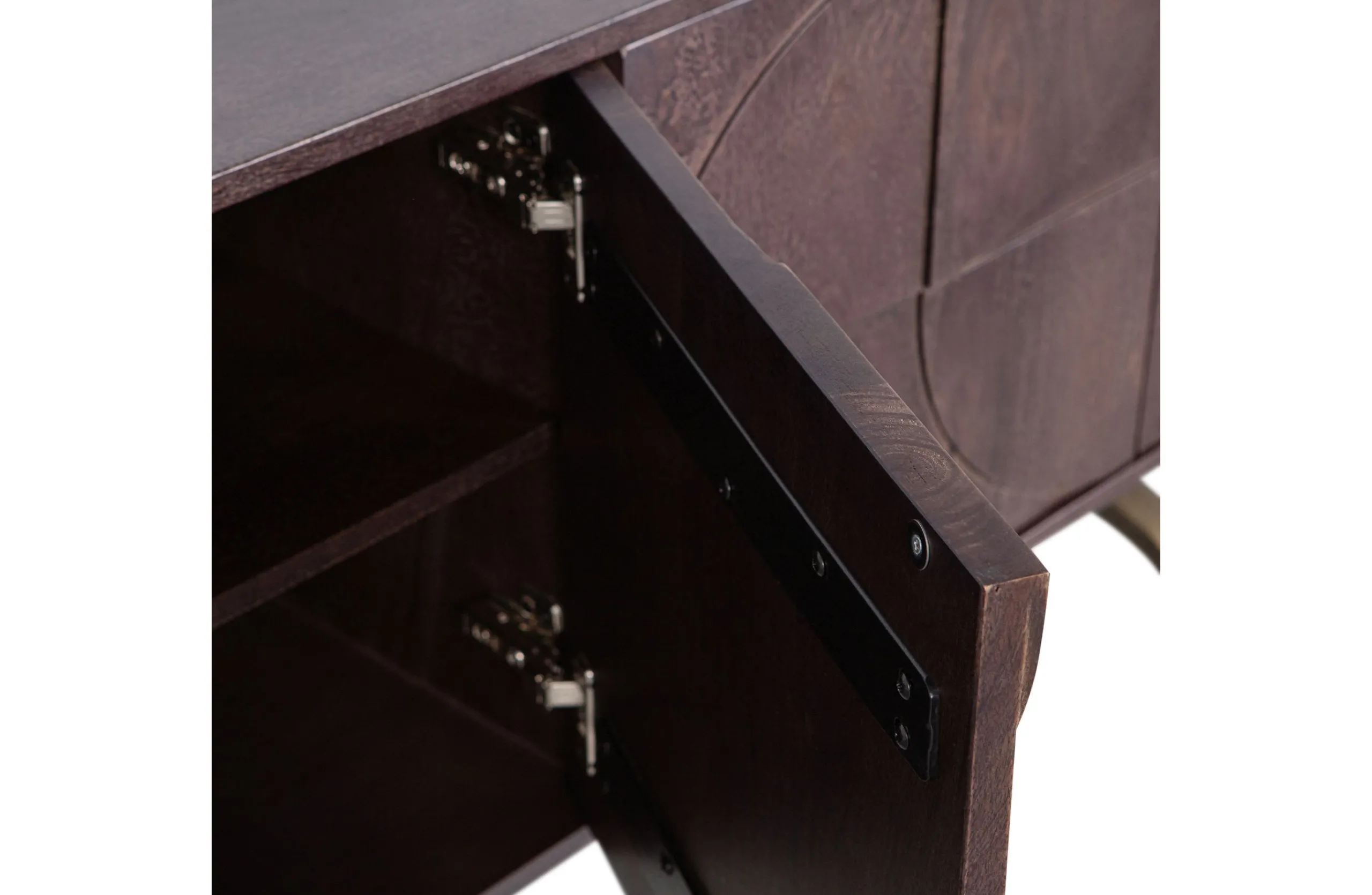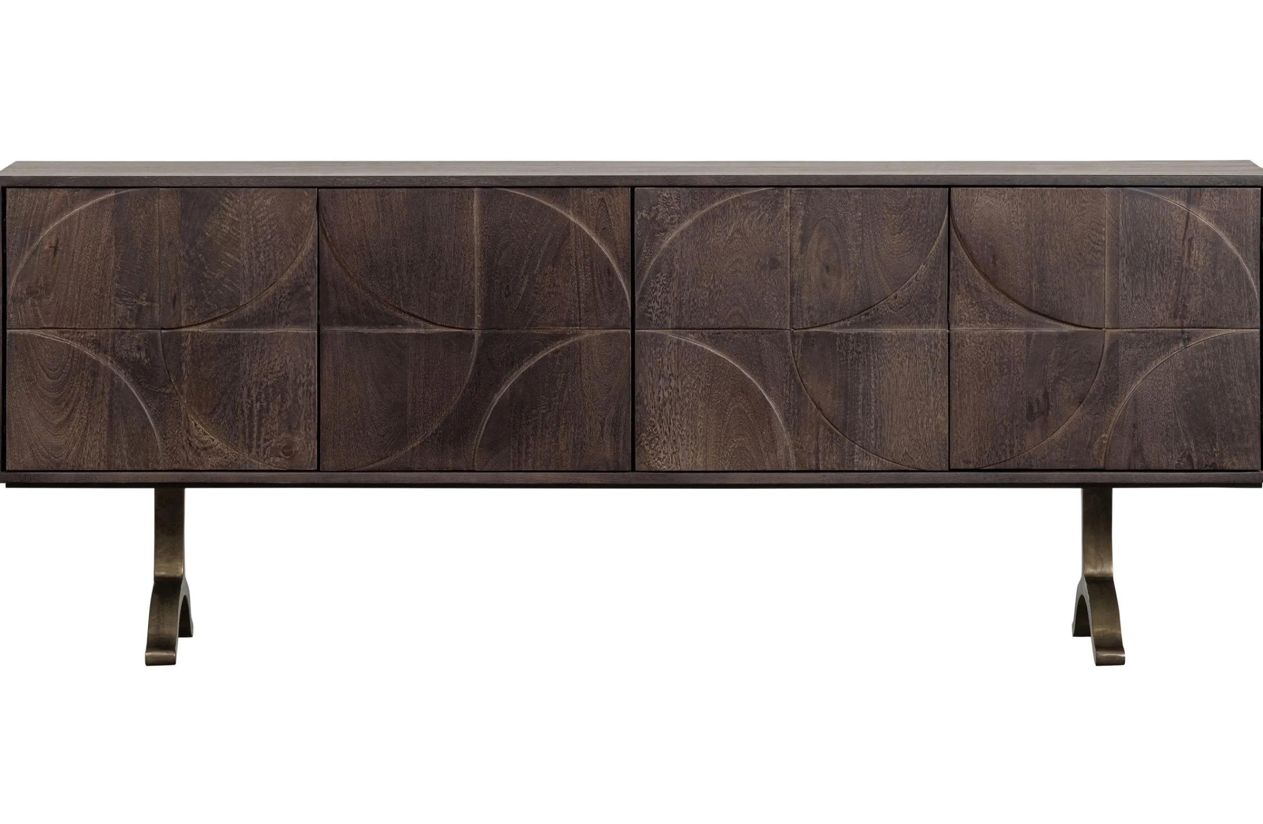 Ausgestattet mit vier Türen bietet dieses Massivholzsideboard Stauraum und Ablagefläche. Das dekorative Möbelstück im schicken Retro-Stil ist ideal im Wohn- und Schlafzimmer einsetzbar. Machen Sie sich sein einzigartiges Design zu Nutzen und werten Sie Ihr Zuhause damit auf! Das warme Walnuss-Finish des Mangoholzes verleiht dem Draw Sideboard sein attraktives Aussehen. Das verspielte Fußgestell sorgt für Leichtigkeit und für große Stabilität. Das 3D-Muster auf den Türen erzeugt eine einzigartige Atmosphäre. Das Zusammenspiel von Materialien und die grafischen Formen sind ein echter Hingucker. Elegant, modern und gleichzeitig funktional. Auf der Rückseite befinden sich zusätzlich zwei praktische Kabellöcher.