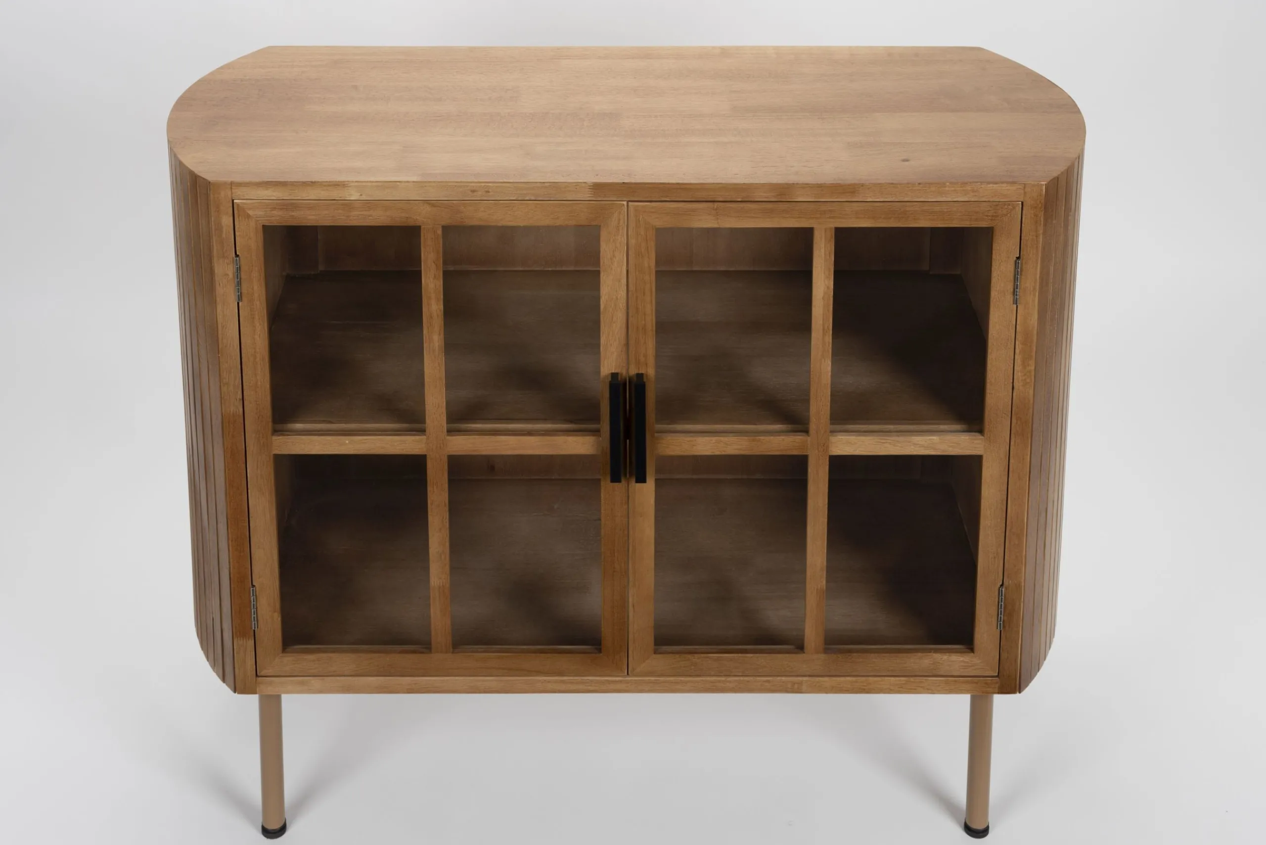 Die abgerundeten Kanten und die feine Maserung des Holzes verleihen dem Schrank eine warme und natürliche Ausstrahlung, die sich mühelos in jeden Wohnstil integriert. Die schlichten, schlanken Metallfüße sorgen für Stabilität und verleihen dem Möbelstück gleichzeitig eine moderne Note.