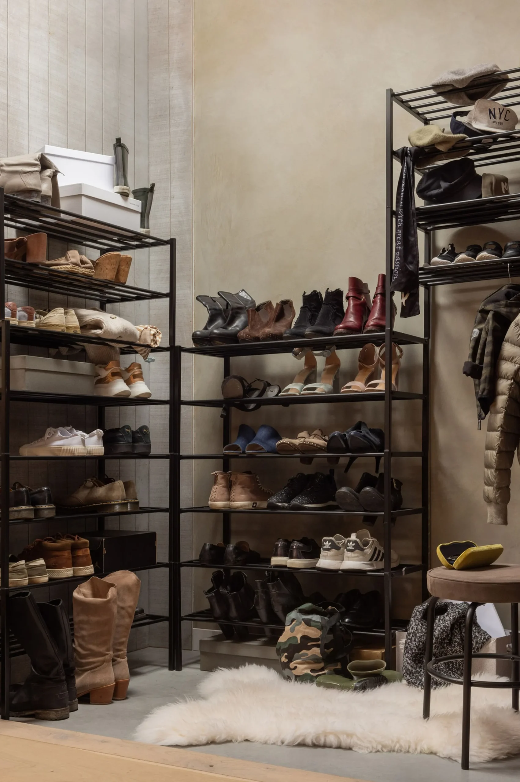 Das Schuhregal Ferro ist ein eigener Entwurf aus der Kollektion der niederländischen Marke WOOOD. Ferro ist aus Metall gefertigt und hat eine pulverbeschichtete, schwarze Oberfläche. Das praktische an diesem Metallregal ist, dass es stapelbar und somit beliebig erweitert werden kann. Durch die verschiedenen Regalhöhen ist dann auch schnell mal eine komplette Garderobenwand mit Platz für Jacken gebaut. Die Höhe der Fächer beträgt 18 cm, die maximale Tragfähigkeit beläuft sich auf 15 kg.