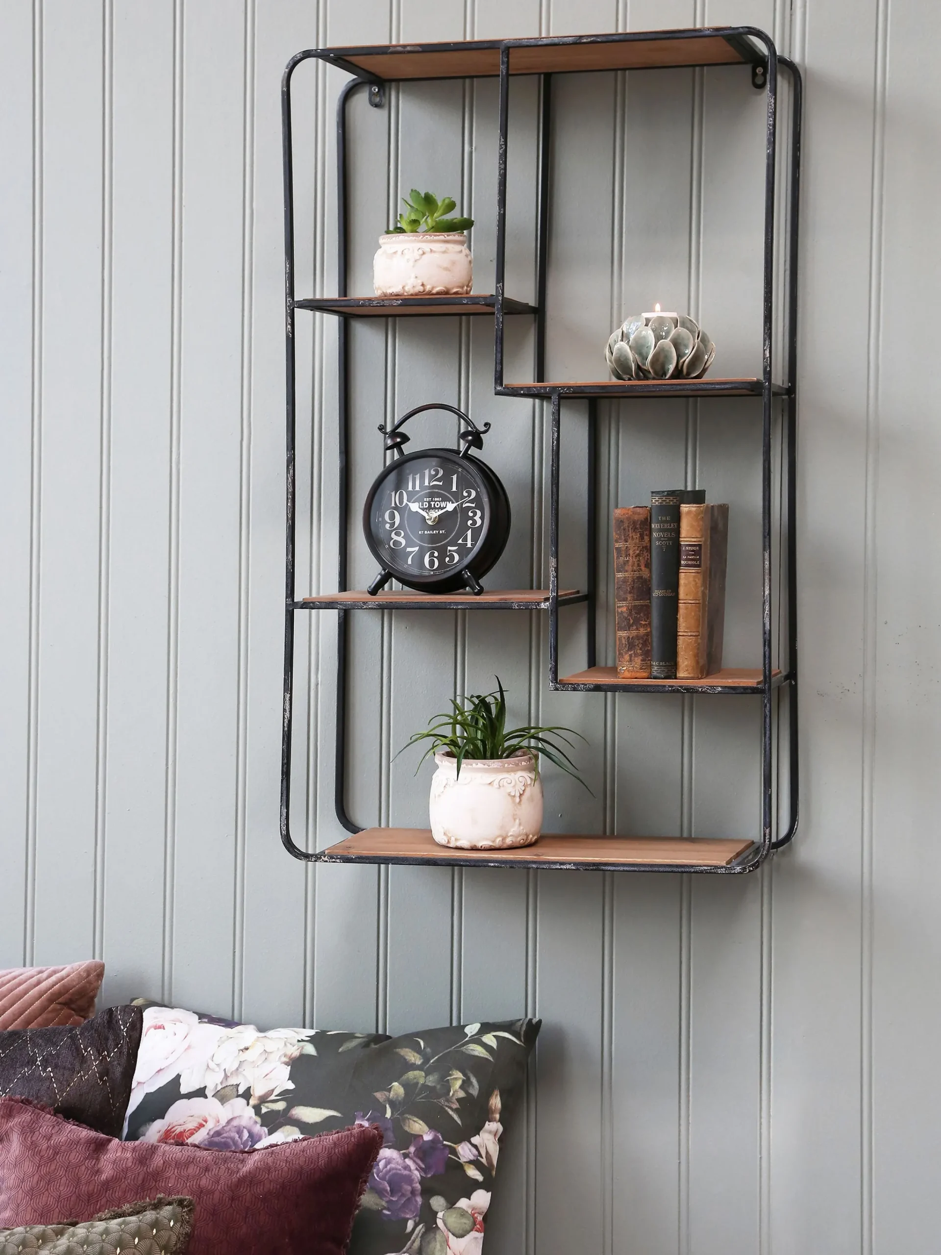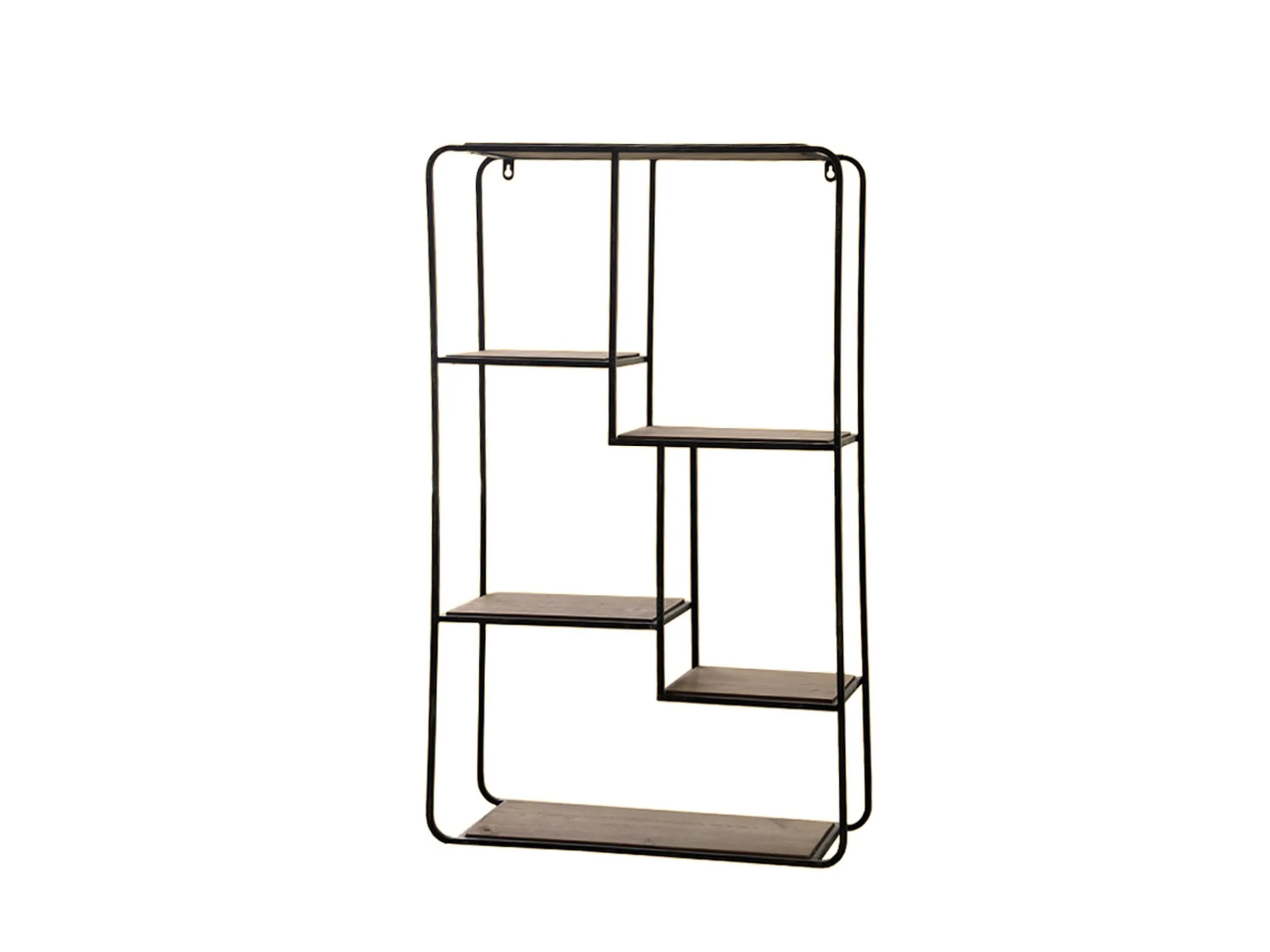 Das Regal besteht aus einem schwarzen Metallgestell im Used-Look mit sechs Regalböden aus Holz in unterschiedlichen Größen und Höhen. Aufgrund der aussergewöhnlichen Aufteilung wird das Regal zum Blickfang. Gebrauchsspuren sind gewollt und tragen somit zum Design bei. Durch seine kompakte Größe findet es schnell seinen Platz an der Wand.
